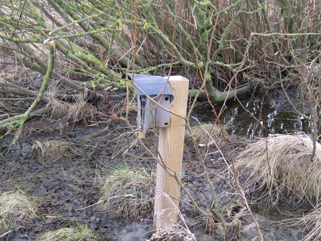 Am 9.2.2015 fand ich im Speicherkoog nordöstlich des Wöhrdener Lochs am Rande eines Biotops eine Wildkamera, die auf einen Luderplatz gerichtet war. Ein Reh-Kadaver wurde hier offensichtlich beobachtet. Wieder wurden die Vorschriften nicht eingehalten. Die Kamera wurde auf einem Grundstück betrieben, dass jeder betreten darf und es waren keine Hinweisschilder vorhanden.