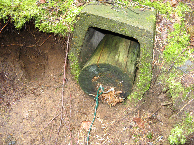 Diese Art Falle, die unauffällig in den Waldboden eingelegt wird, ist ein künstlicher Fuchsbau, der durch eine Röhre in einen unterirdischen Kessel führt. Die Ausgänge der Röhren können mit Holzblöcken je nach Bedarf geöffnet oder geschlossen werden. Das Ganze wird dann mit Laub und Reisig gut getarnt. Füchse werden von Jägern mit Hundefutter in diese Falle gelockt. Ein solches Bauwerk ist nach meinen Informationen genehmigungspflichtig, jedoch trägt keine der mir bekannten Fallen die erforderliche Kennzeichnung. Sie sind also vermutlich auch gar nicht registriert und damit illegal.
